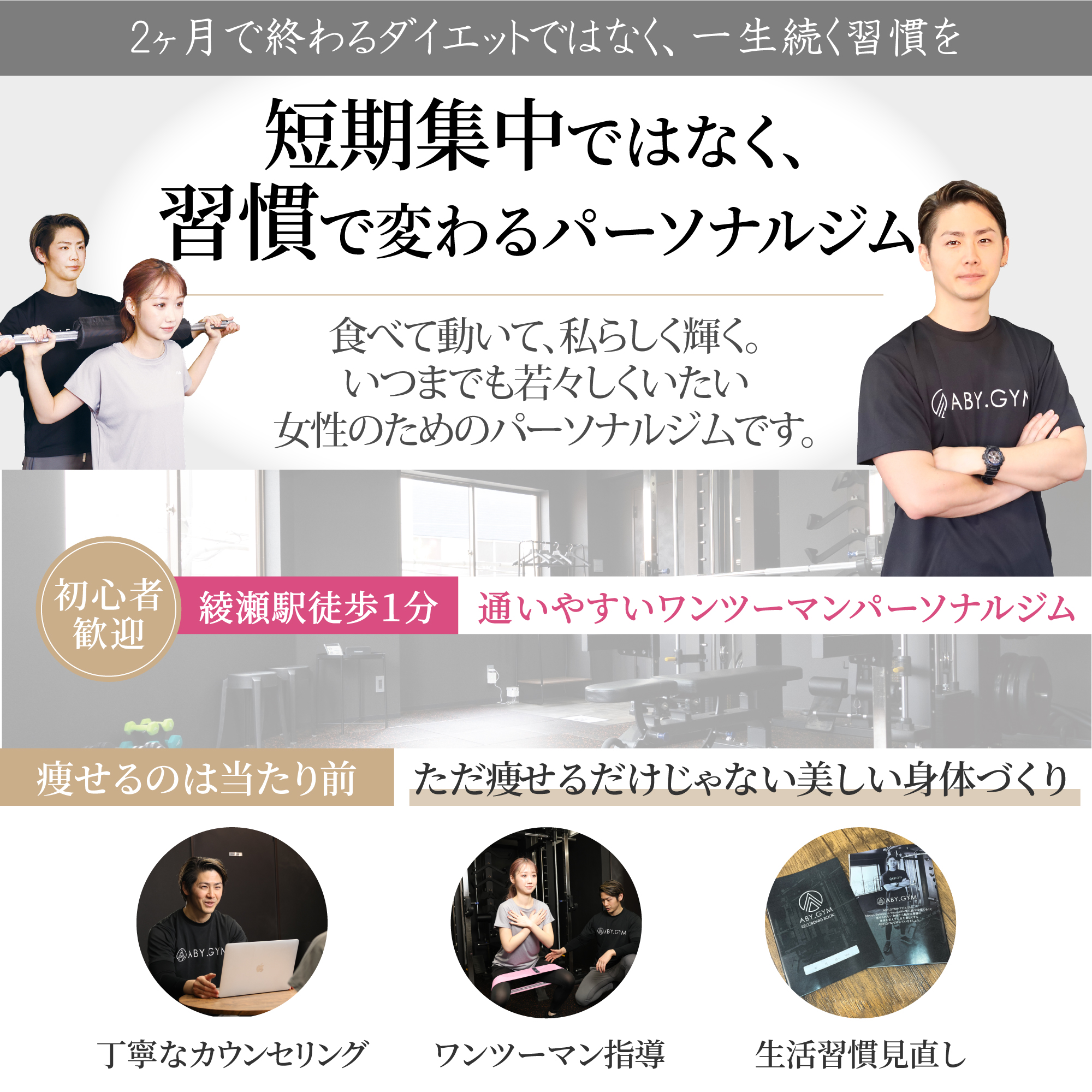 忙しい毎日の中でも、女性はいつまでも綺麗でいたいもの。 でも「短期ダイエット」や「無理な食事制限」は、続かずリバウンドの原因になってしまいます。 ABY.GYMが大切にしているのは、“習慣化”による美しさづくり。 一人ひとりのライフスタイルに合わせた食事管理とトレーニングで、無理なく続けられる方法をご提案します。 「痩せる」だけではなく、 「健康的に、美しく、そして自分らしく生きる」ための身体づくり。 それがABY.GYMの目指すパーソナルトレーニングです。