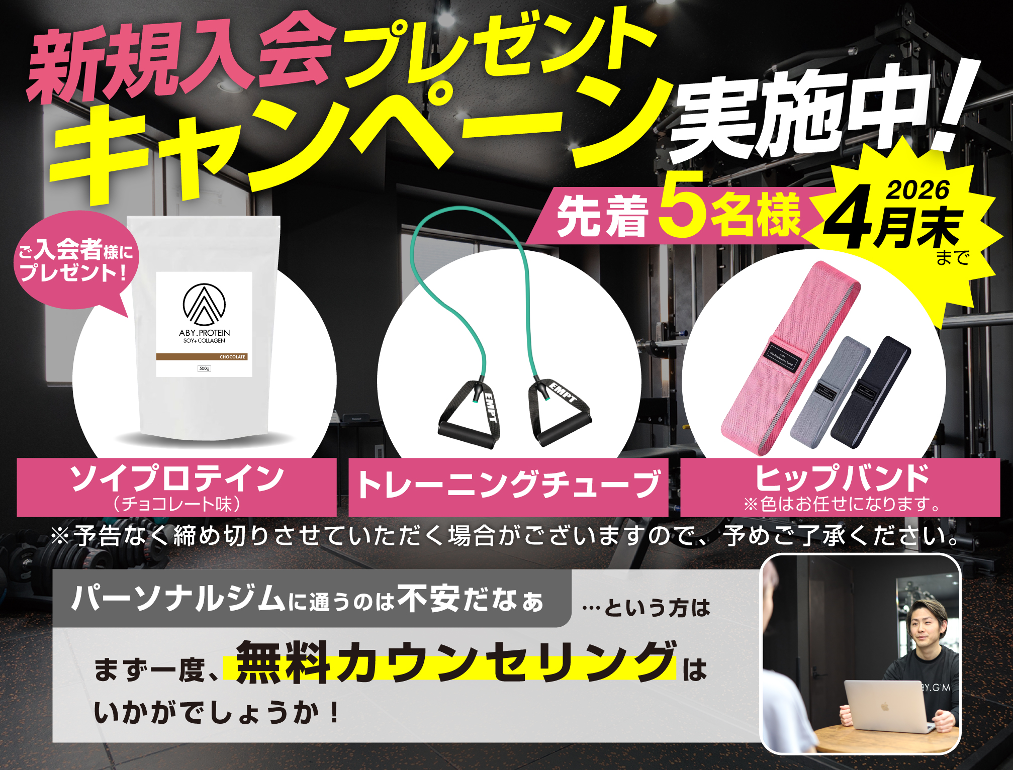 また、ABY.GYMでは、他のクライアント様にご迷惑が掛かるような行為・ スタッフに対する高圧的な態度・不合理なものを要求される場合は、入会をお断りいたします。ご了承下さい。